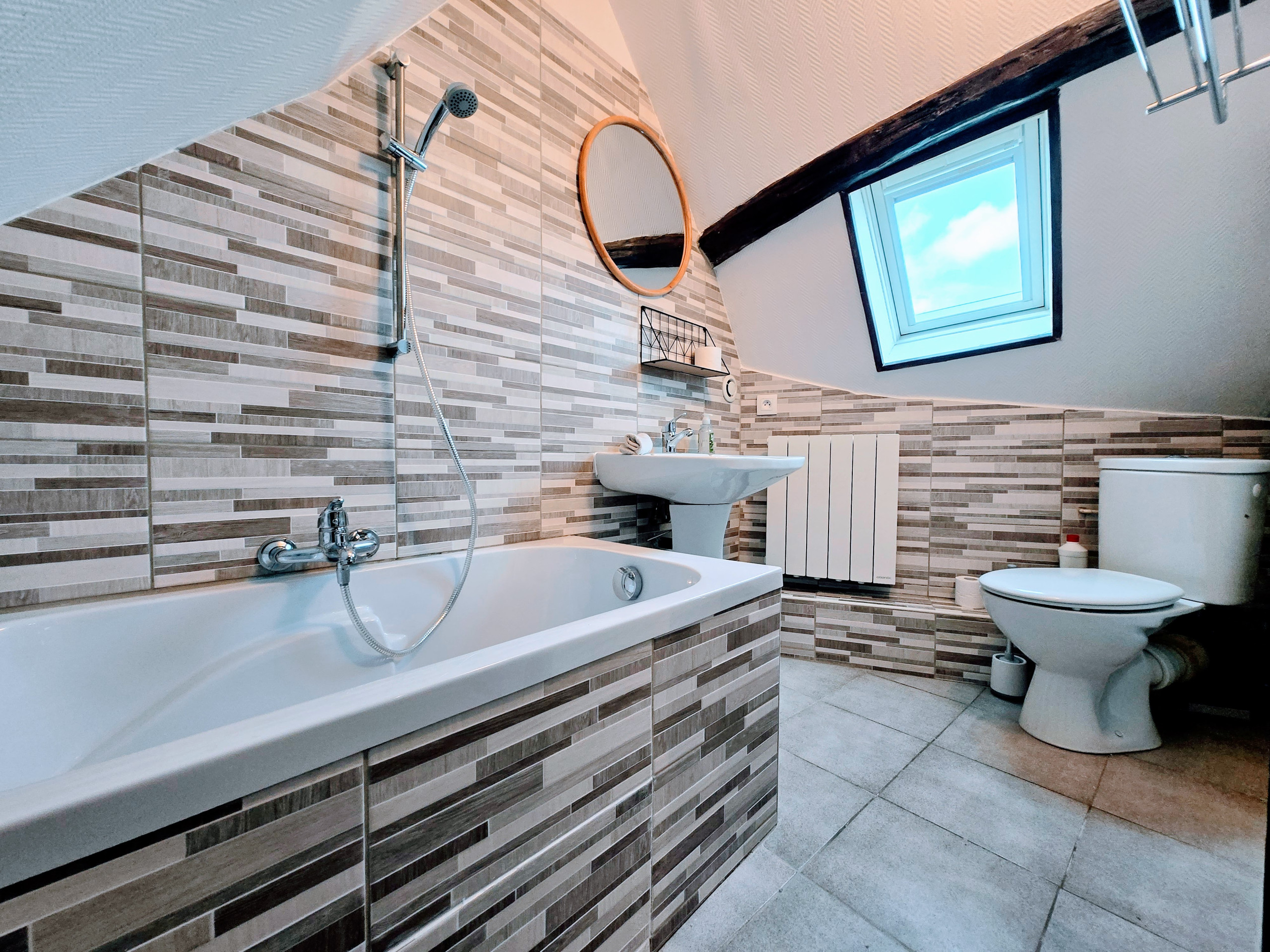 Etage - Salle de bain : Salle de bain complète avec baignoire et WC pour votre confort et commodité.